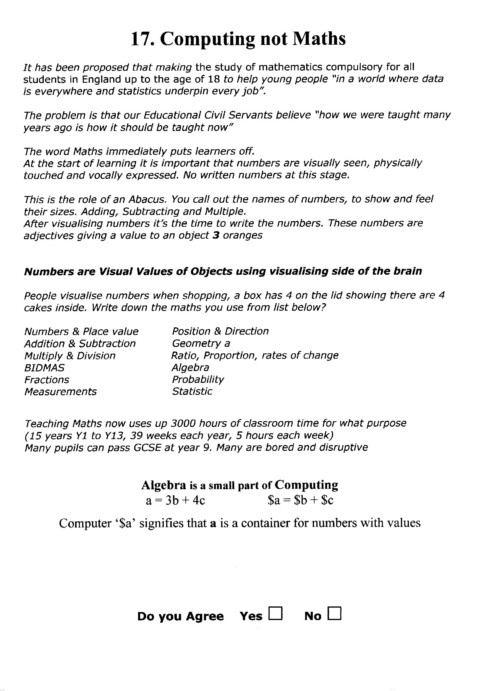 Use of Computing/Maths. Finding and using knowledge to perform physical tasks. Algebra is a fundamental of Computing. Writing Apps